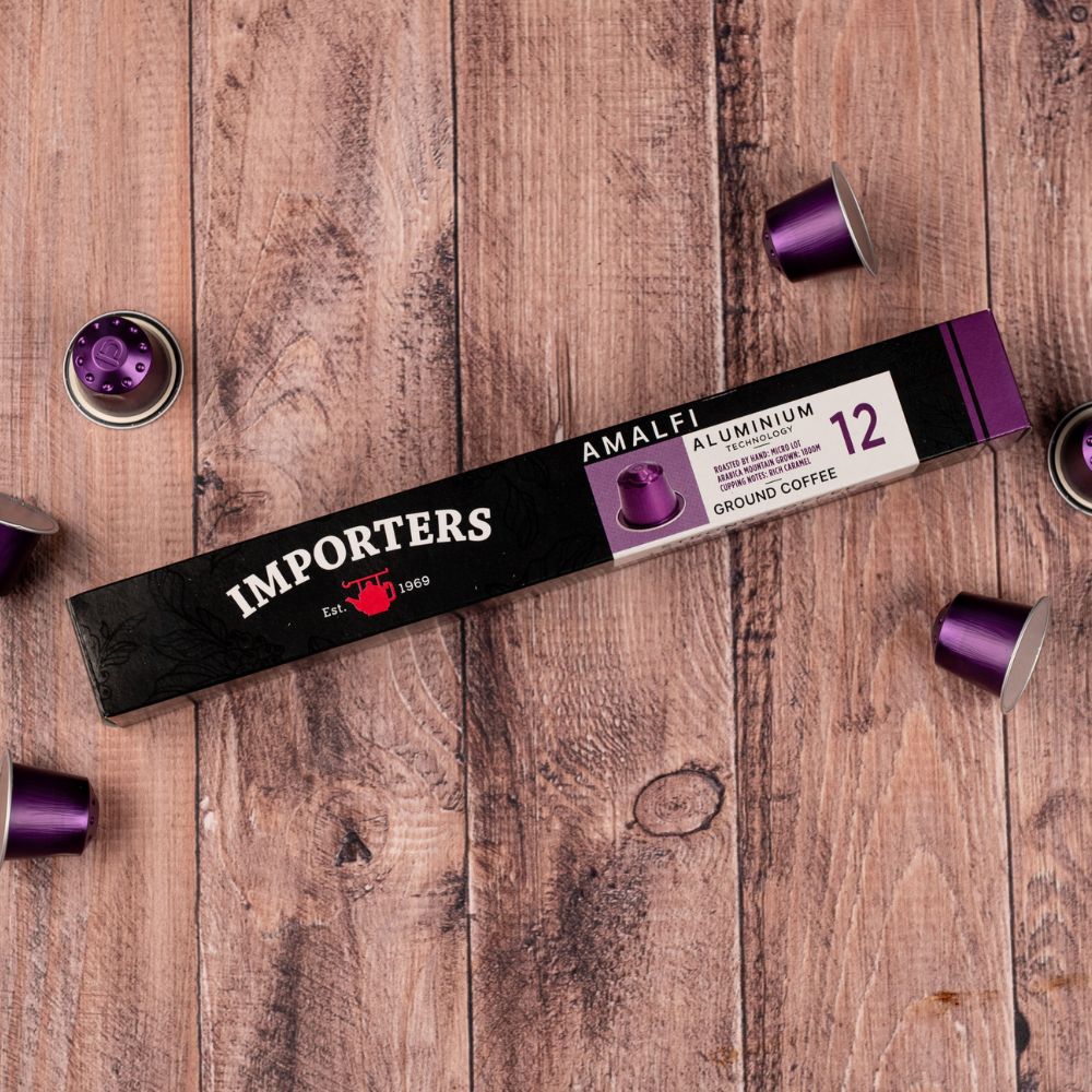 Importers Amalfi Aluminium Nespresso Compatible Coffee Capsules - Strength 12 out of 12: Arabica Mountain Grown coffee, a strong 12 roasted by hand with intense caramel notes.