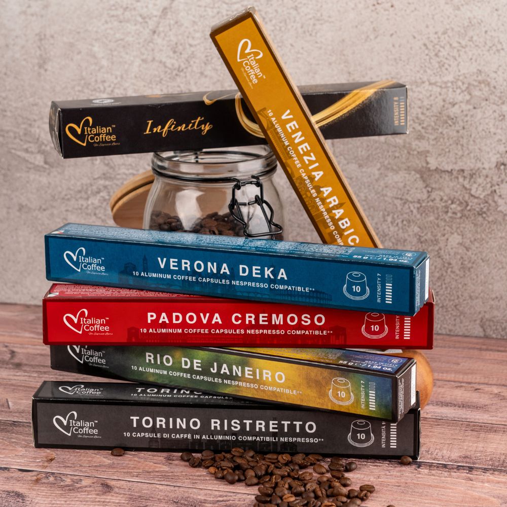 Embark on a coffee journey like no other with Italian Coffee Aluminium full range variety pack. This bundle includes 10 pods each of six extraordinary blends, offering you a delightful tour of coffee destinations from around the world. With 10 pods of each blend, you'll have the opportunity to explore, savour, and share these exceptional coffees with friends and family.