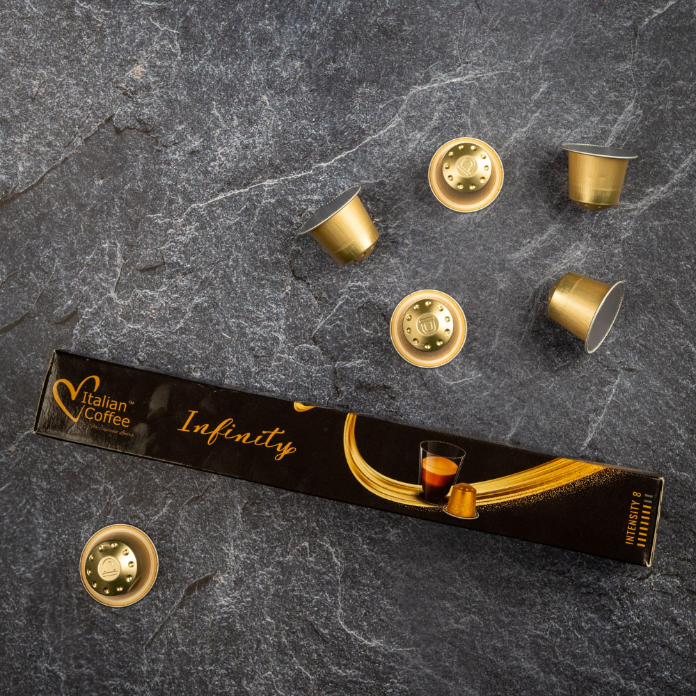 Italian Coffee Arabica Colombia Infinity Aluminium Nespresso Original compatible coffee capsules are crafted from carefully selected beans sourced from a single territory, Colombia, this coffee's sensory profile is influenced by its place of origin.