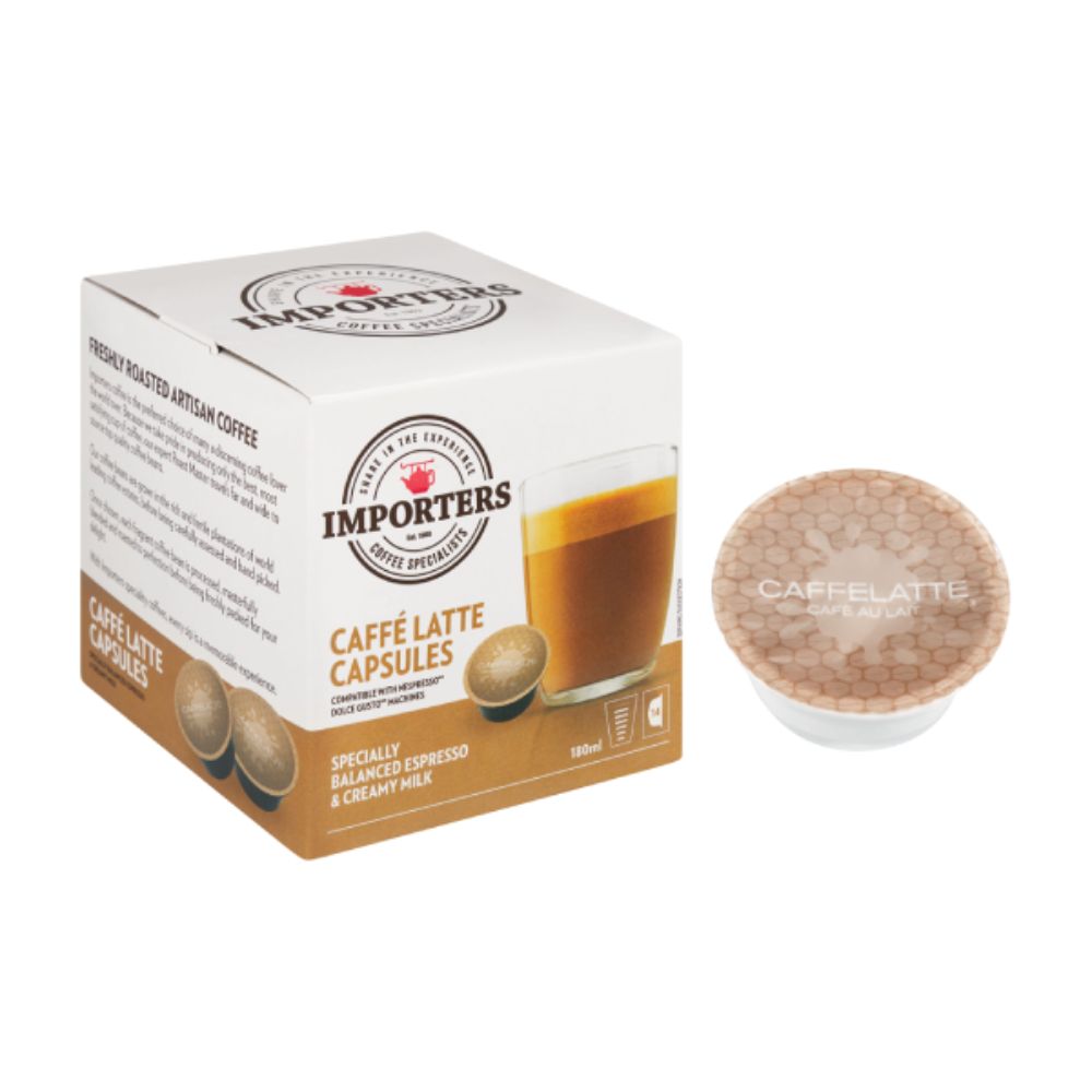 Enjoy a smooth, creamy café-style latte at home with the Importers Caffé Latte 14-pack capsules, compatible with Dolce Gusto® machines. Perfectly balanced espresso and velvety milk create a rich, indulgent coffee experience in every cup.
