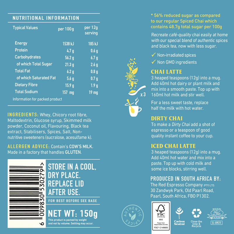 • 1 x 150g Tin - Instant Spiced Chai Reduced Sugar Latte (12 Servings)