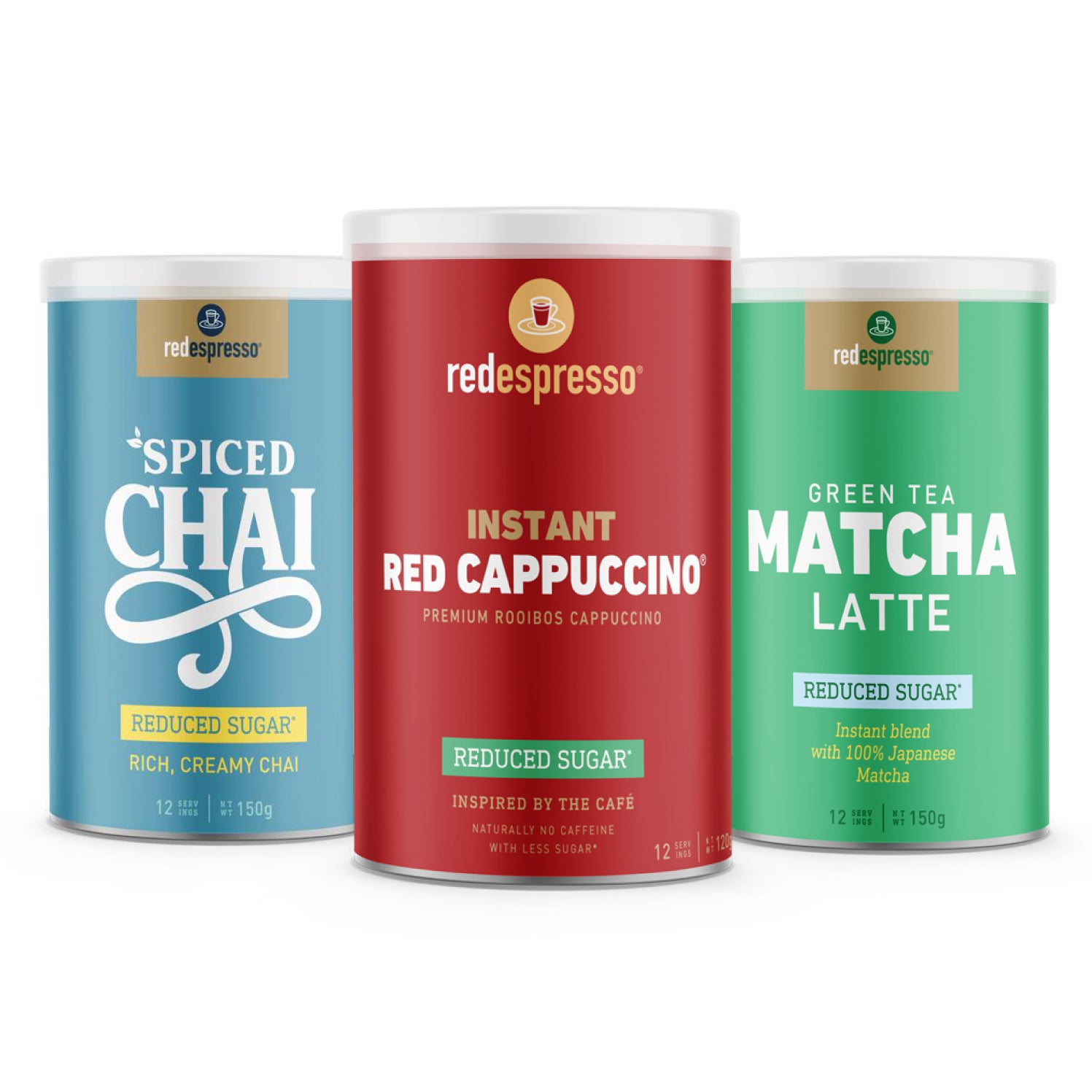 Delight in a pleasantly delectable red espresso reduced sugar instant bundle. Treat yourself and your loved ones to a delicious instant reduced sugar spiced chai, instant reduced sugar matcha and instant reduced sugar rooibos red cappuccino.