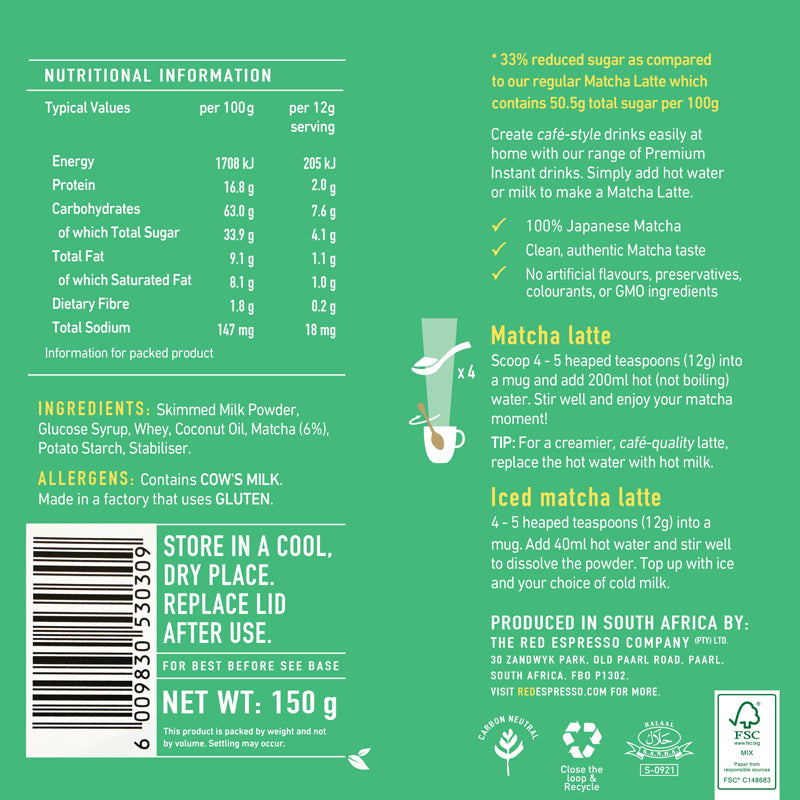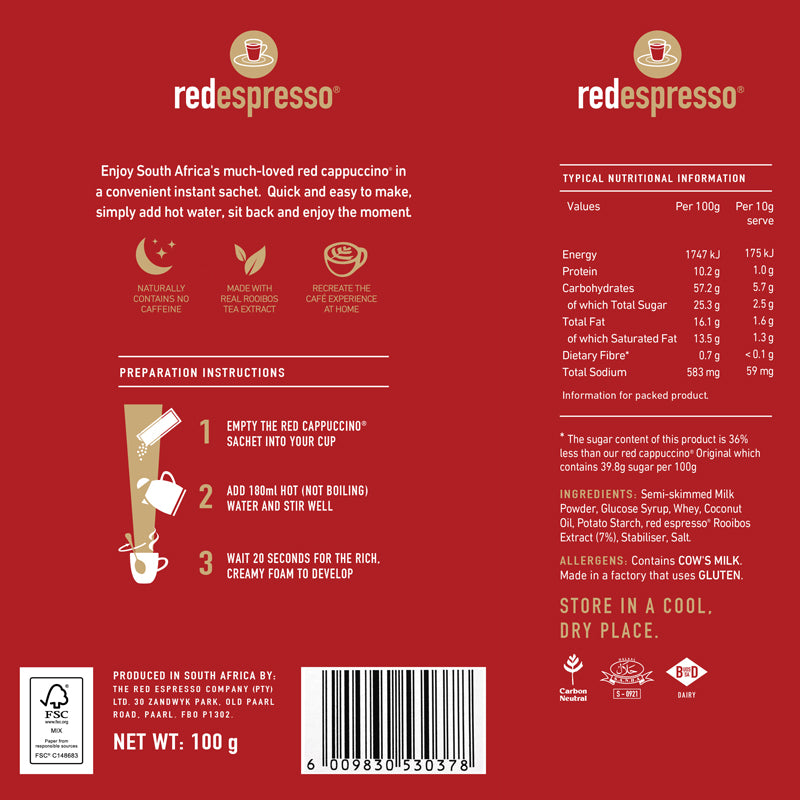 Ingredients: Semi-Skimmed Milk Powder, Glucose Syrup, Whey, Coconut oil, Potato Starch, red espresso® Rooibos Extract (7%), Salt, Cellulose Gum, Stabiliser: Potassium Phosphate.