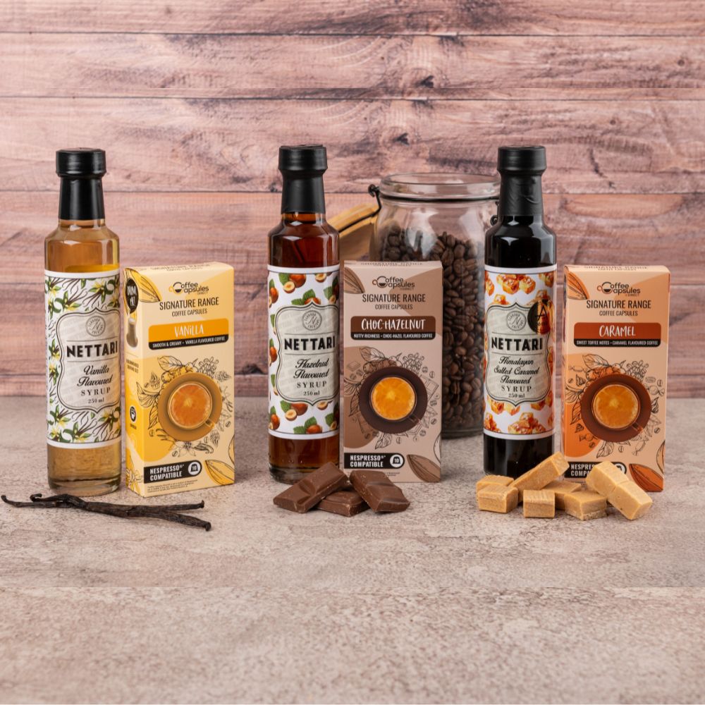 Level up your barista skills with this amazing Flavoured Coffee and 3 Nettari Syrups. Make your favourite Choc Hazelnut Espresso, Caramel Cappuccino or Vanilla Latte and add flavoursome flair to it with the Nettari Syrup range. Everything a flavoured coffee should be!